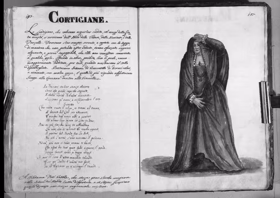 Le Cortigiane, che volevano acquistar credito, col mezzo della finta onestà, si servivano dell’Abito delle Vedove, delle Maritate, e delle Donzelle. Dovevano star sempre serrate, e coperte con la Cappa, di maniera che non potendo esser vedute, erano sforzate scoprirsi alquanto, e perciò impossibile, che Elle non venissero conosciute a qualche gesto. Essendo inoltre proibite loro le perle, erano maggiormente additate per tali, quando mostravano il Collo dissabbegliato. Portavano Sottane di Broccatello di diversi colori, e ricamate, con molta spesa; e quelle di più riguardo affettavano Scarpe alla Romana dentro alle Pianelle.